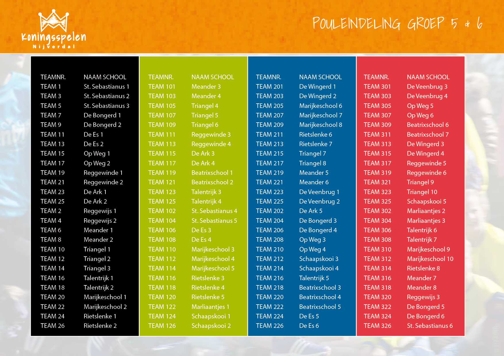 Welkom op de website van de Koningsspelen Nijverdal. Elk jaar organiseert Reggesteyn Noetsele de Koningsspelen Nijverdal voor de groepen 5/6 en 7/8 van de basisscholen. Bekijk de website met instructiefilmpjes en instructiekaarten. Poule-indeling Schema’s Plattegronden Organisatie: Vakgroep bewegingsonderwijs CSG Reggesteyn NoetseleNoetselerbergweg 207441 BK NijverdalTel. (0548) 533 700